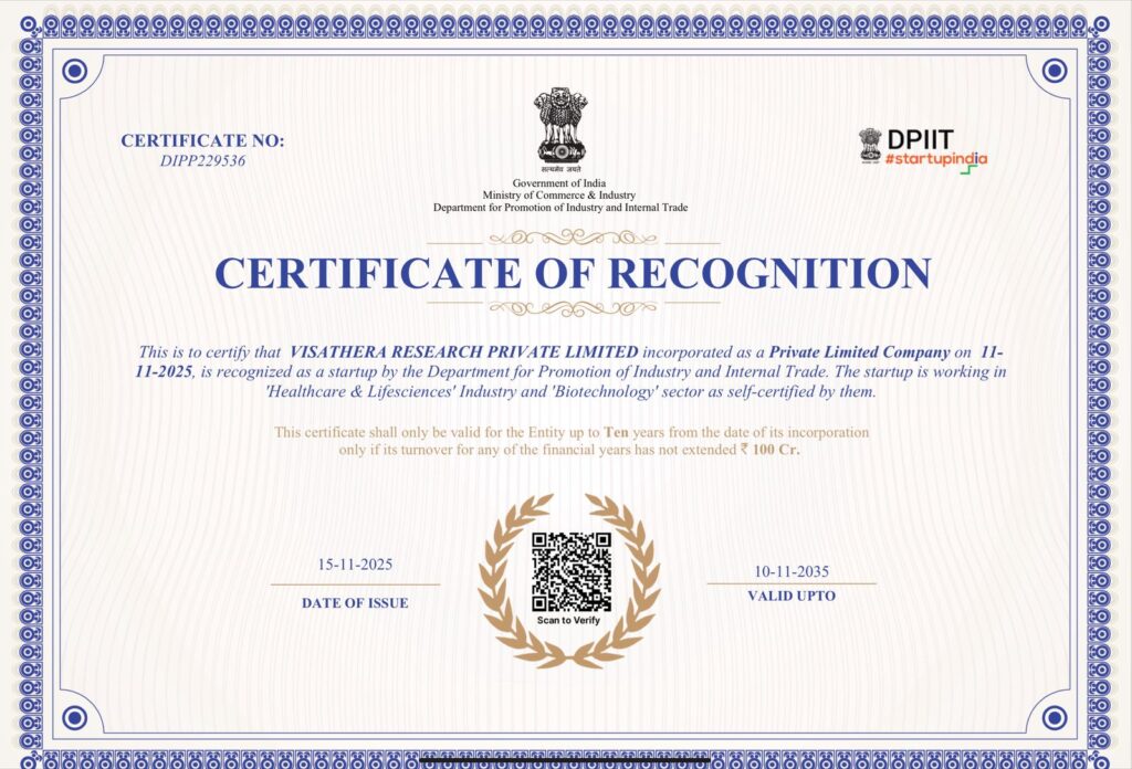 VisaThera Research Private Limited is officially recognised as a DPIIT-registered startup under the Startup India initiative, Department for Promotion of Industry and Internal Trade, Ministry of Commerce & Industry, Government of India.